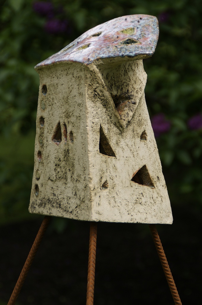 Doordat er in onze tuin verschillende vogels broeden heb ik een serie vogelhuisjes gemaakt voor een expositie in het Arboretum te Oudenbosch. Niet volgens de standaard voor nest kastjes, maar op een vrije manier, waarbij ik niet gekeken heb of er vogels in zouden gaan broeden. Meestal staan ze op ijzeren staven met op de grond keramiek voetjes, dit om de vogels te beschermen tegen katten etc.