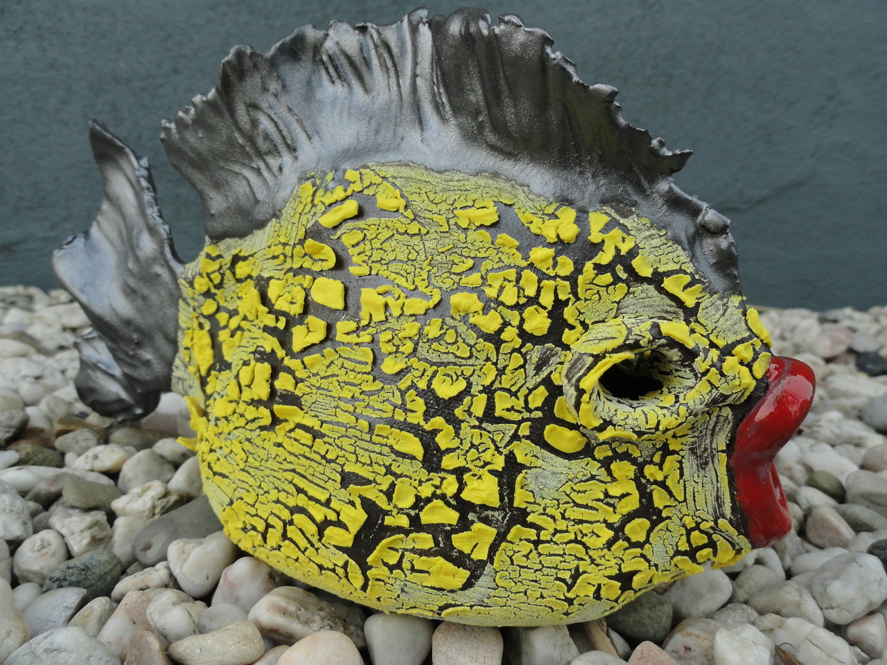 vis gemaakt van zwart bakkende klei, geglazuurd met terugtrekkende gele glazuur . Hierdoor is een schubben effect ontstaan. De vinnen en staart zijn met zilveren aardewerkglazuur afgewerkt en gestookt op 1060 graden in een elektrische oven.