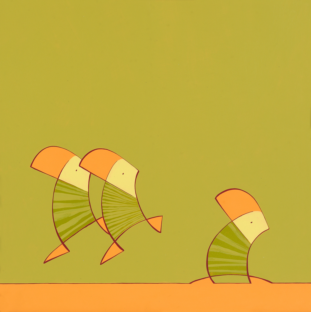 Schilderij van twee duikertjes die bij een ander duikertje weg springen met de kleuren groen en oranje