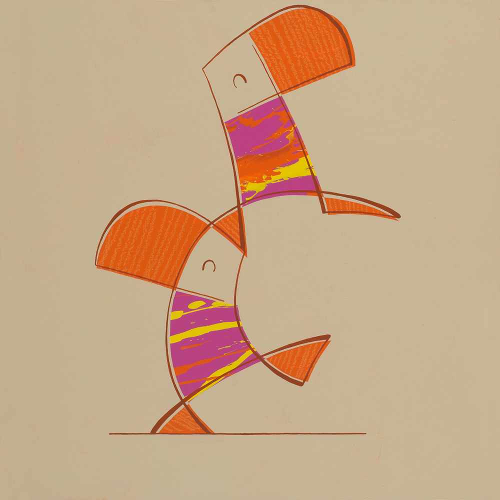 Schilderij van twee blije Duikertjes die op elkaars hoofd staan en blij kijken.