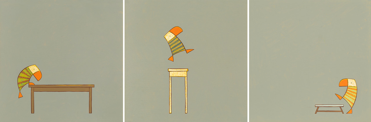 Een drieluik met op elk schilderij een Duikertje en een tafel (eettafel, bijzettafel en een salontafel). De duikertjes in hun gestreepte jasjes zijn bezig op de tafels te klimmen of te springen. De schilderijen hebben allemaal hun eigen gele lijst. de schilderijen meten 39 x 39 cm per stuk. de totale lengte komt ongeveer op 150 cm (met lijst en al en een een net stukje tussenruimte) http://www.jasperoostland.com/vergrotingen/12117.html