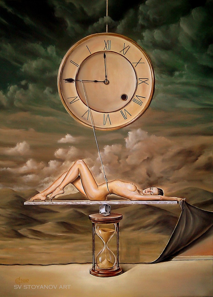 For Sale Art Nude Green Painting Figurative Clouds Oil Contemporary Woman Surrealism Clock Fine Realis