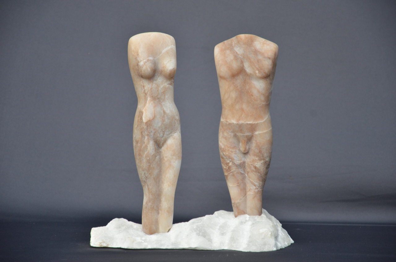 Echt is gemaakt van 2 pilaartjes bruine albast. De man en vrouw (ECHTpaar) zijn op een sokkel van witte albast geplaatst.