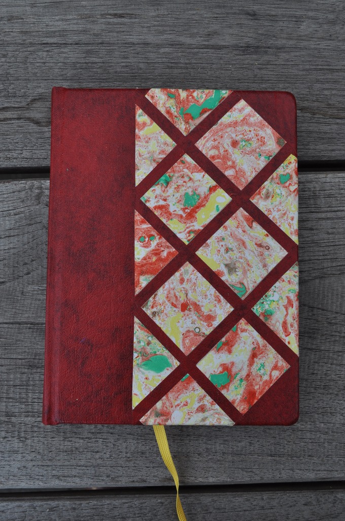 Handebonden notitiebook. Gebonden in kunstleer en marmerpapier.