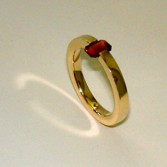 Stijlvolle geelgouden 14 karaat ring met citrien uit Brazilie. Door de spanning in het metaal zit de citrien ertussen geklemd. Deze ring heeft een bijzonder warme uitstraling en draagt erg prettig.
