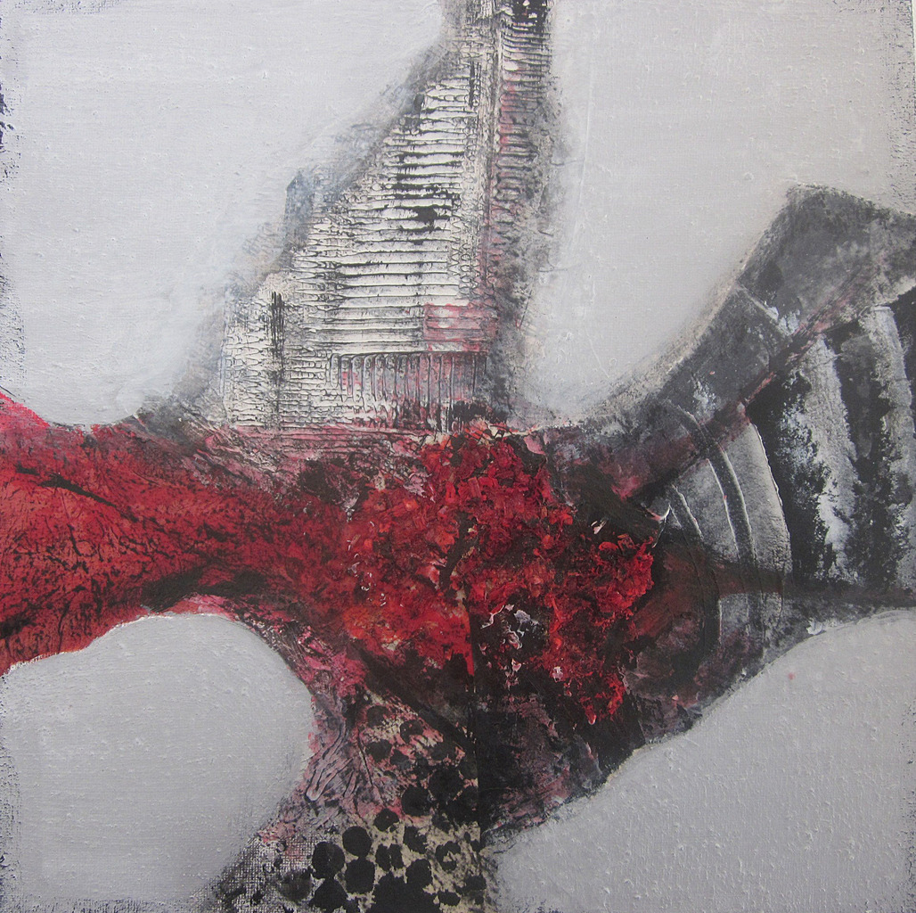 Wit Grijs Rood Zwart Acryl Vogel Hout Papier Collage Pasta Gesso Pigment