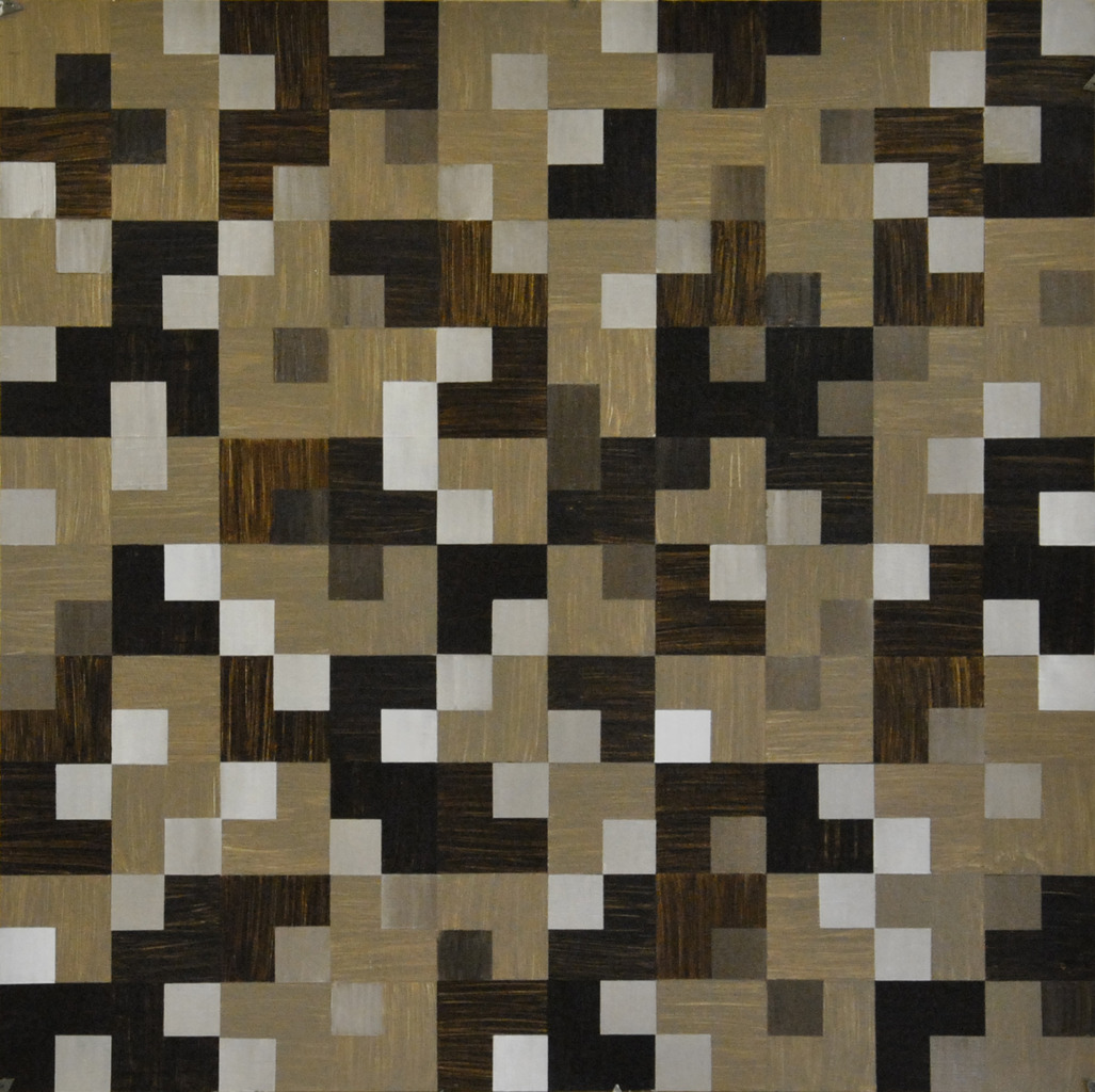 Thema: Chaos (Geometrische Chaos) Mijn kunst is beïnvloedt door de moderne wiskundige en wetenschappelijke benadering van het begrip complexe orde van de natuur. Met name heb ik me verdiept in de Chaos theorie en de fractal geometrie. Ik ben geen wiskundige, en ik gebruik geen wiskundige formules. De ideeën van de Chaos theorie en fractal geometrie leiden tot de ontwikkeling van de composities in mijn werk. Ik gebruik driehoeken,vierkanten en cirkels in mijn schilderijen, maar in mijn huidige serie, geoChao richt ik me alleen op de vierkanten en de verhoudingen tussen de vierkanten. Ik ontwikkel mijn composities door kleine vierkantjes op grote te zetten of grote op kleine te zetten. Het gaat om de onderlinge verhoudingen tussen de vierkanten. Ik laat de methode die ik kies de compositi