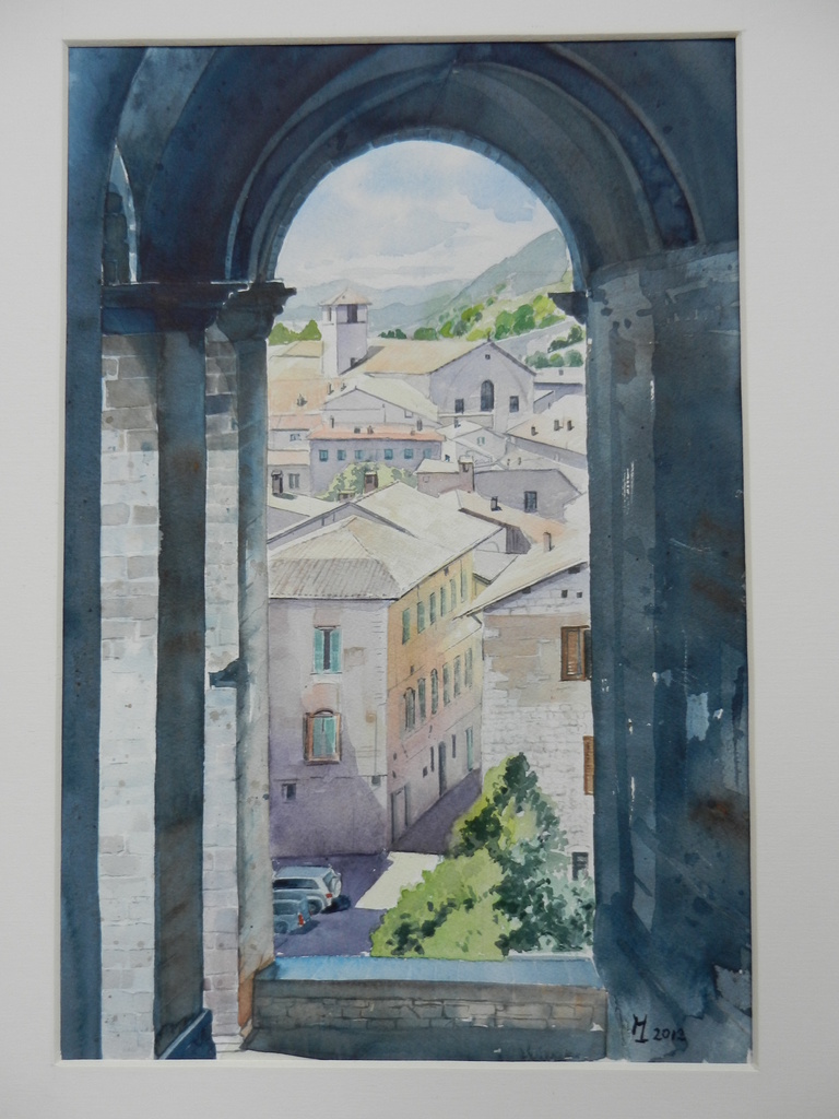 Uitzicht op Gubio vanuit Palazzo dei Consoli. Ik werd getroffen door het contrast tussen de fraaie donkere galarij, en het uitzicht op de blokachtige zonovergoten huizen.