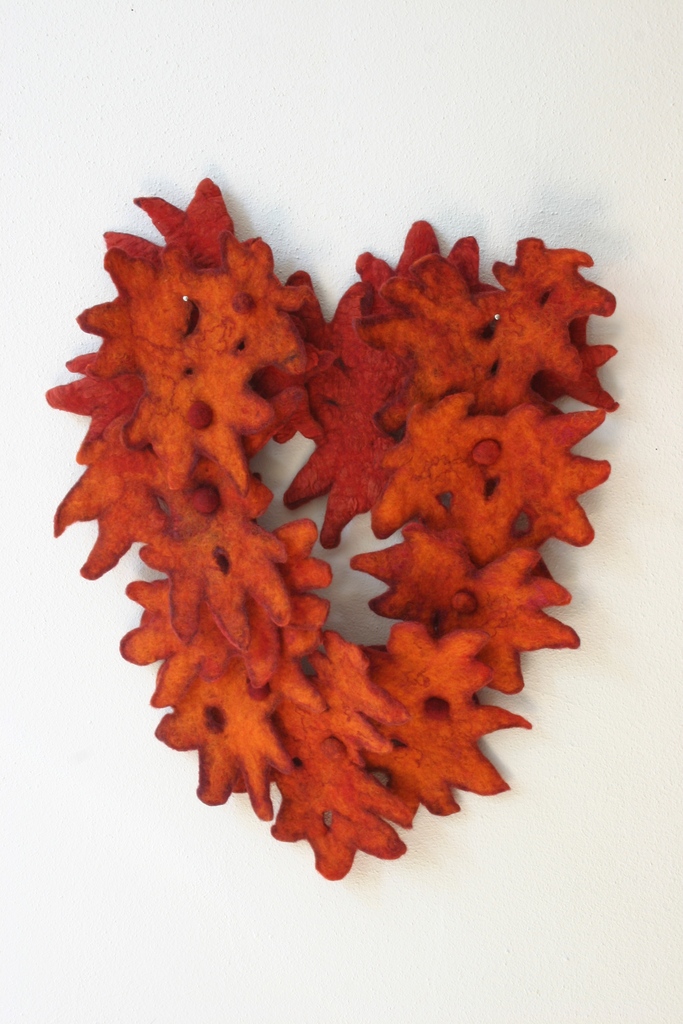 Het materiaal waar ik mee werk is wol dat ik vervilt tot draagbare kunst en viltpanelen. In mijn werk staat het onderzoek en experiment centraal. De natuur is mijn inspiratiebron