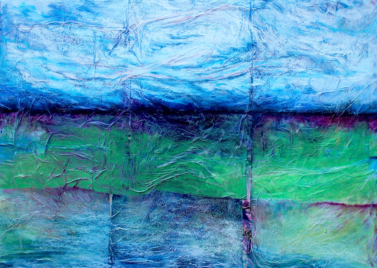 Abstract Landschap Blauw Groen Water Lucht Weiland Trein Skyline Zakdoek Weidsheid Kreukels Passeren Driedeling Papier Horizon Vlakken Vakken Vierkant