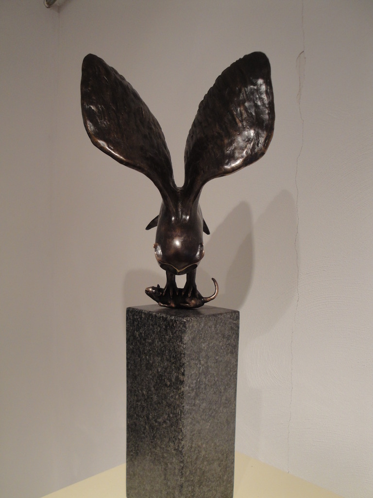 Uil die muis vangt, gemaakt in brons. Tafereel uit de natuur.