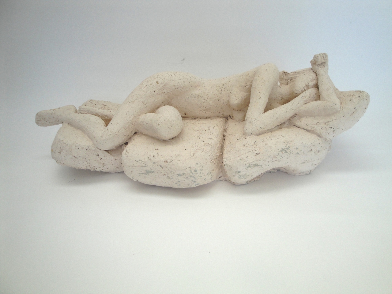 Vrouwelijk naakt, liggend op 3 kussens uitgevoerd in witte chamotteklei.