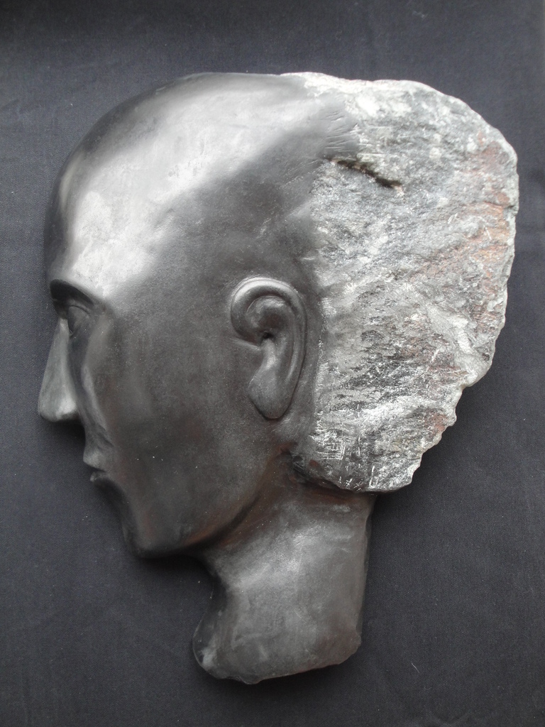 Portret in India serpentijn. Hoogbegaafde man, de haren verlopen in de ruwe steen. Kunstwerk om aan de wand te hangen.