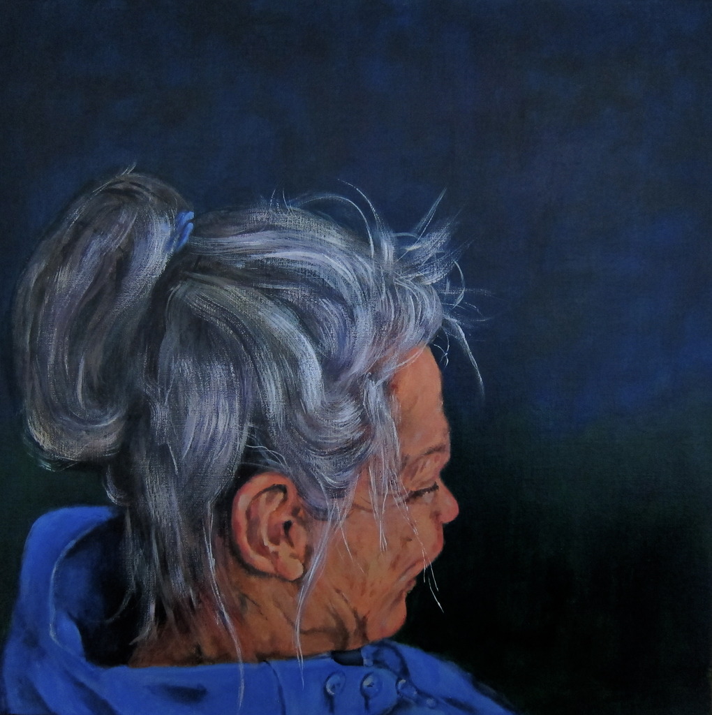 Grijs Blauw Groen Vrouw Gekleed Haar Opgestoken Afgewend Lachen