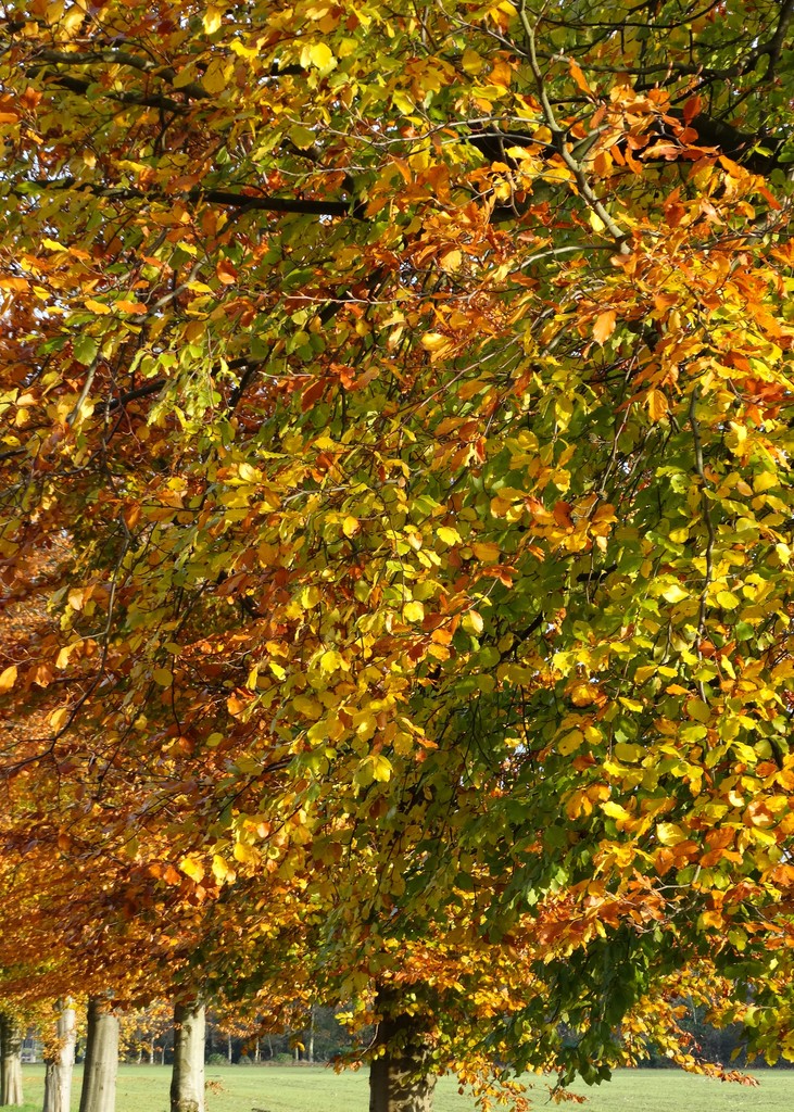 Goudgele bladeren van een rij beuken in herfsttooi met een fikse wind.