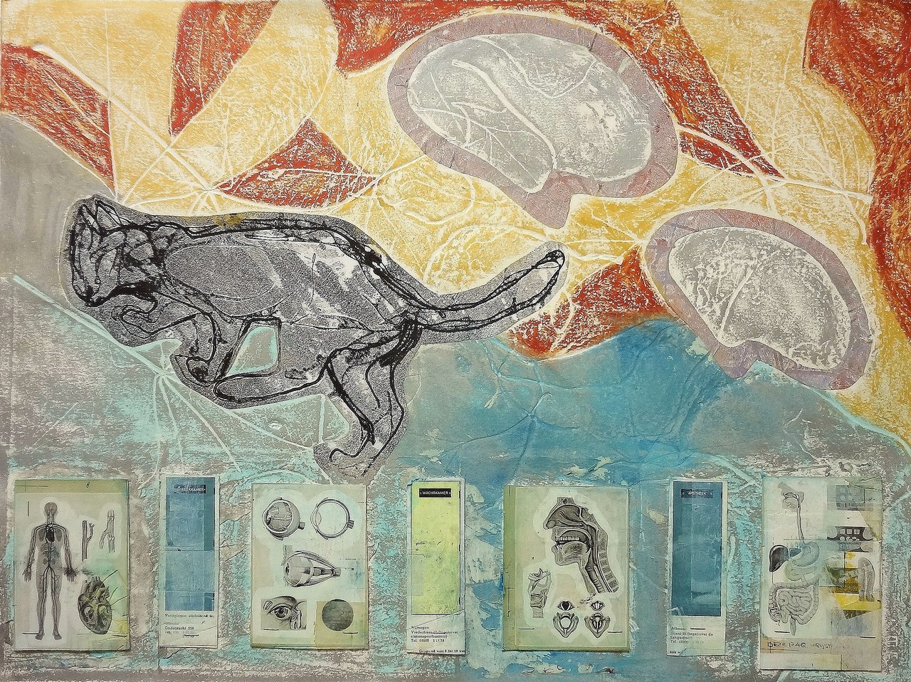 Ik werk impulsief,gedreven en intuïtief.De natuur is mijn grootste inspiratiebron.De landschappen in mijn etsen en monotypes stralen een bepaalde sfeer uit:romantisch,dreigend, verlaten en spannend.Het onderwerp kan beïnvloed worden door iets inspirerends wat op mijn pad komt.Naar aanleiding van een bezoek aan de voorraadkelders van de oude medische instrumentenwinkel van A. van der Kuip te Utrecht,heb ik met dit medisch materiaal zowel ruimtelijk werk,dozen en glazen boxen,als vlak werk gemaakt waaronder monotypes,clichedrukken,collages en tekeningen.