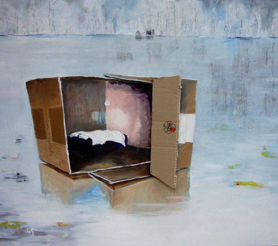 ZomerExpo 2012 heeft een werk van mij gekozen voor het Gemeentemuseum Den Haag. Het hangt er tot 19 aug. Ik werk veelal vanuit zelfgemaakte ensceneringen en wil bij de kijker veronderstellingen oproepen over wat er gaande is op het doek/de foto: wat is er gebeurd, hoe gaat dit verder. 'Als ik in mijn atelier ben, vertraagt de tijd en verkleurt de werkelijkheid. Ik hoop dat ook de kijker dit meemaakt in mijn werk.