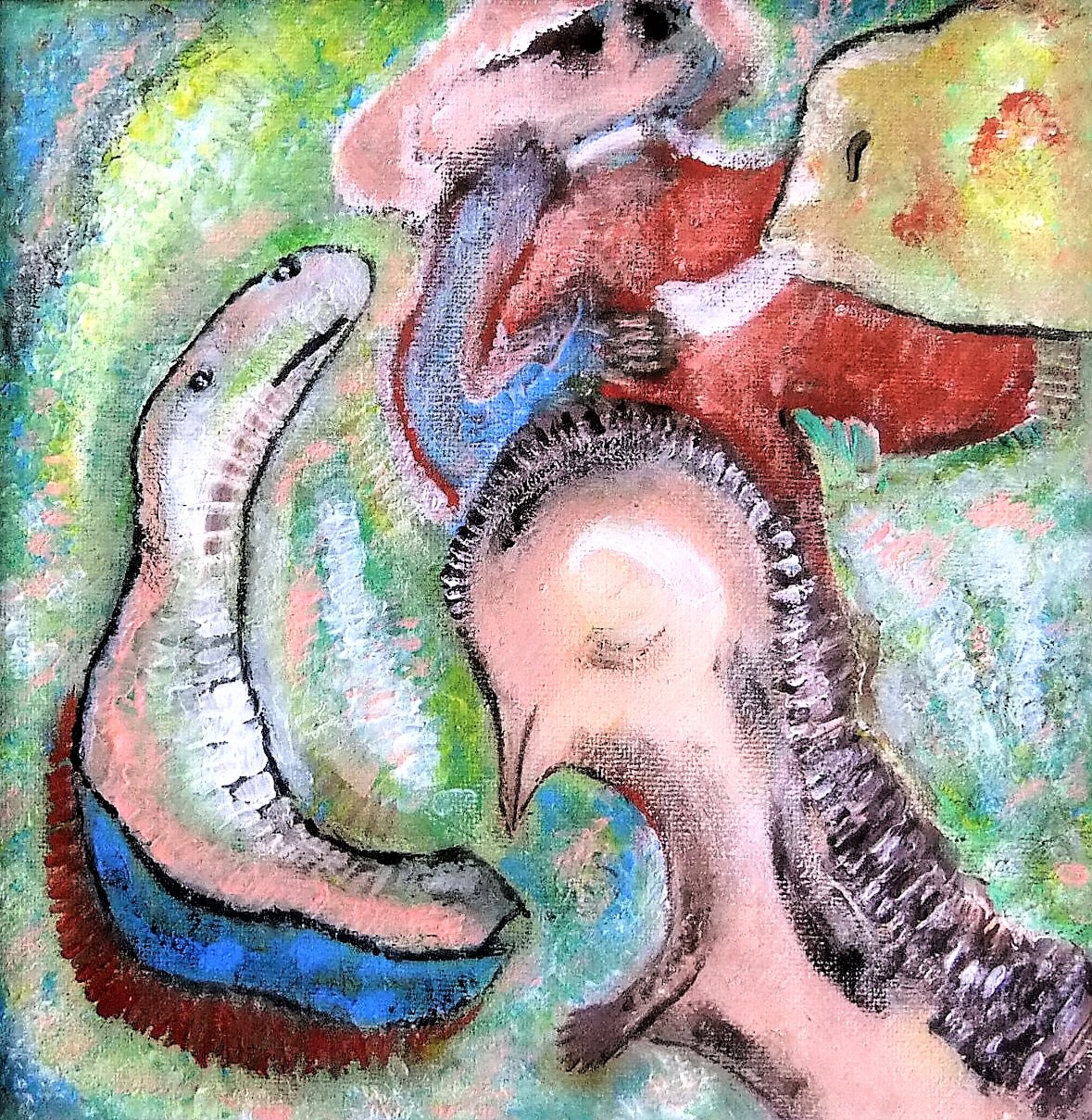 In zijn vroegere werk bracht de kunstenaar met kleurrijke oliekrijttekeningen onbewuste stukken van zichzelf aan het licht. Tegenwoordig maakt hij acrylschilderijen, waarbij de nadruk ligt op spirituele thema's.