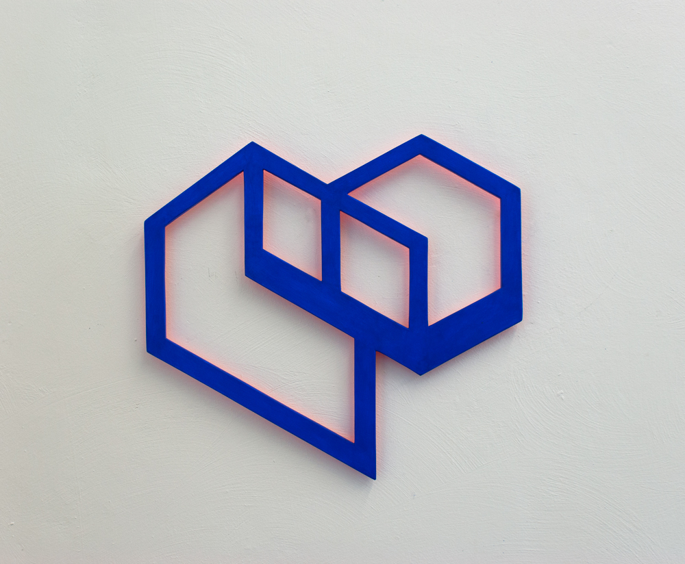 wandobject ultramarijn op hout met rode kleurreflectie