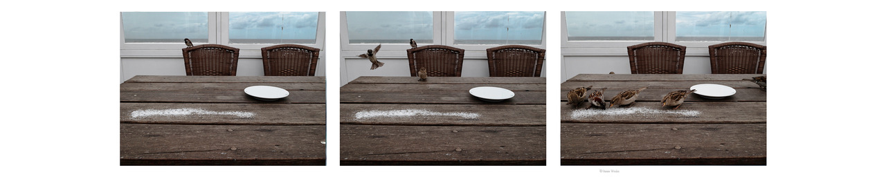De speelsheid van musjes in een schijnbaar georchestreerde omgeving. Ze worden gepresenteerd zoals hier getoond, met 3 foto's binnen 1 kader of deze wijze. Ze zijn samen gedrukt op 1 vel.