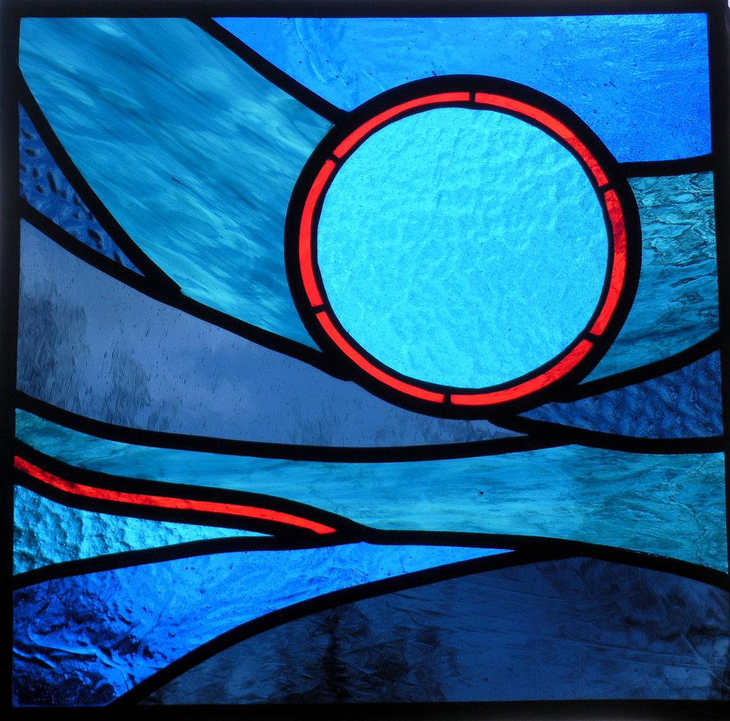 Glas in lood raamhanger Blauwe Maan, een gedeelte is gemaakt in tiffany.