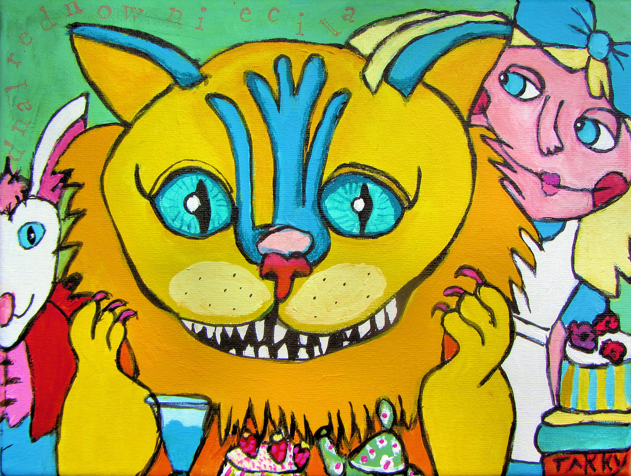 Konijn Kat Mens Kind Kleur Blauw Rood Oranje Geel Groen Taartjes Theepot Tanden Ogen Sprookje Alice Wonderland