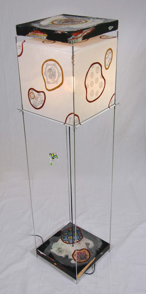 Lotek lamp van Benno Premsela,met de hand bewerkt, 2 schilderijtjes , Buzz Lightyear en een lichtknopje.
