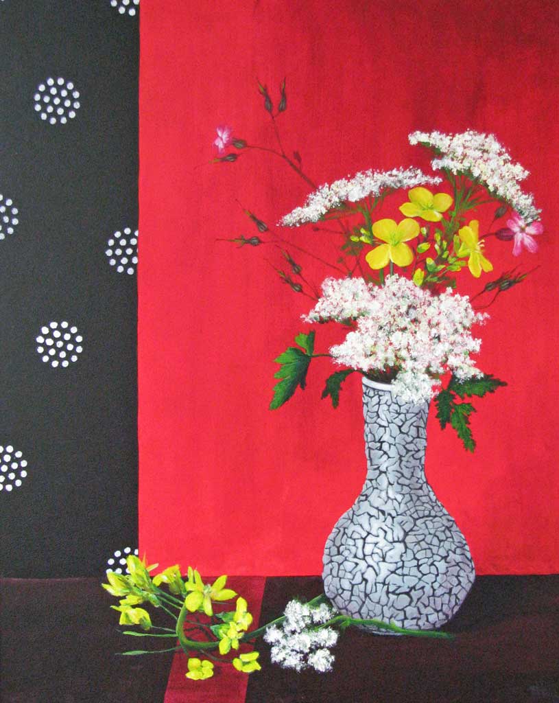 Rood Acryl Paneel Stilleven Craquelé Koolzaad Vaasje Robertskruid