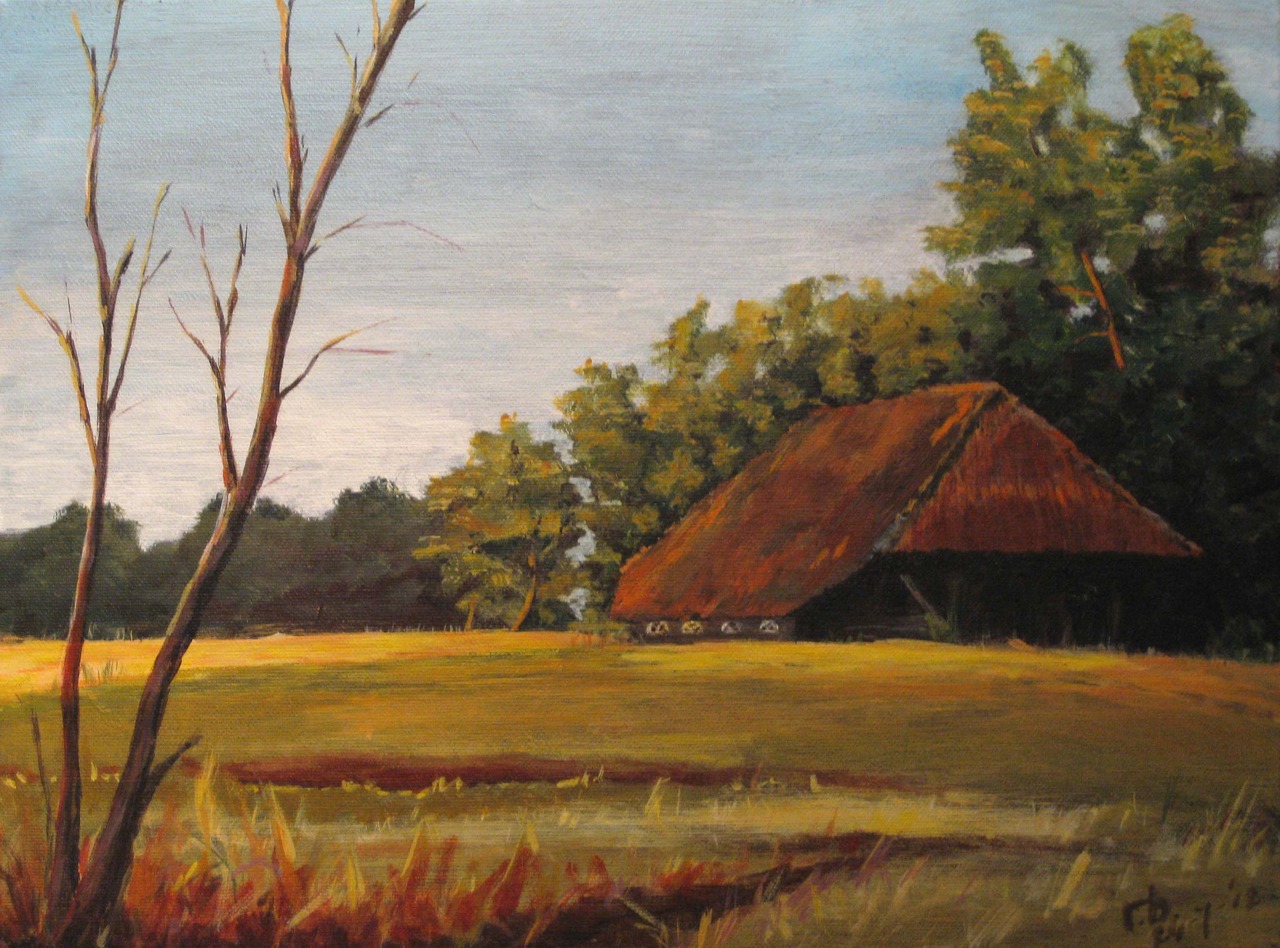 Schuur van de fam. Timmerman, geschilderd "en plein air" bij ondergaande zon