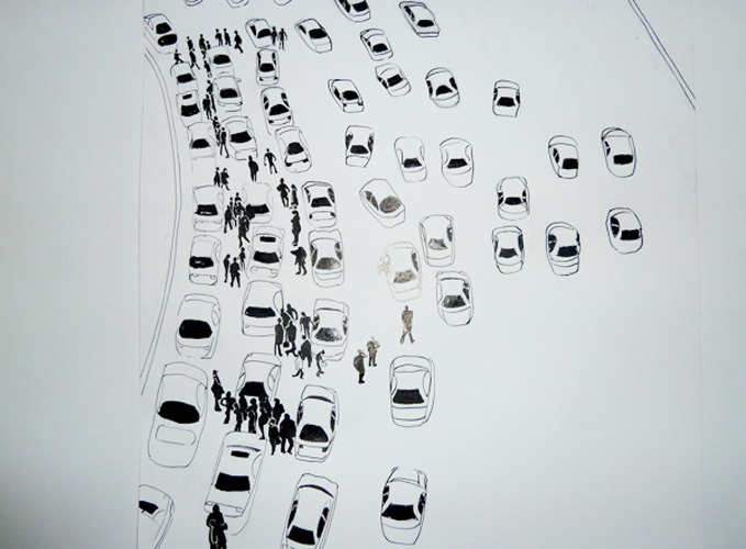 Stakende taxiechauffeurs staan buiten hun auto met elkaar te beraadslagen. Daardoor ontstaat er een fille.