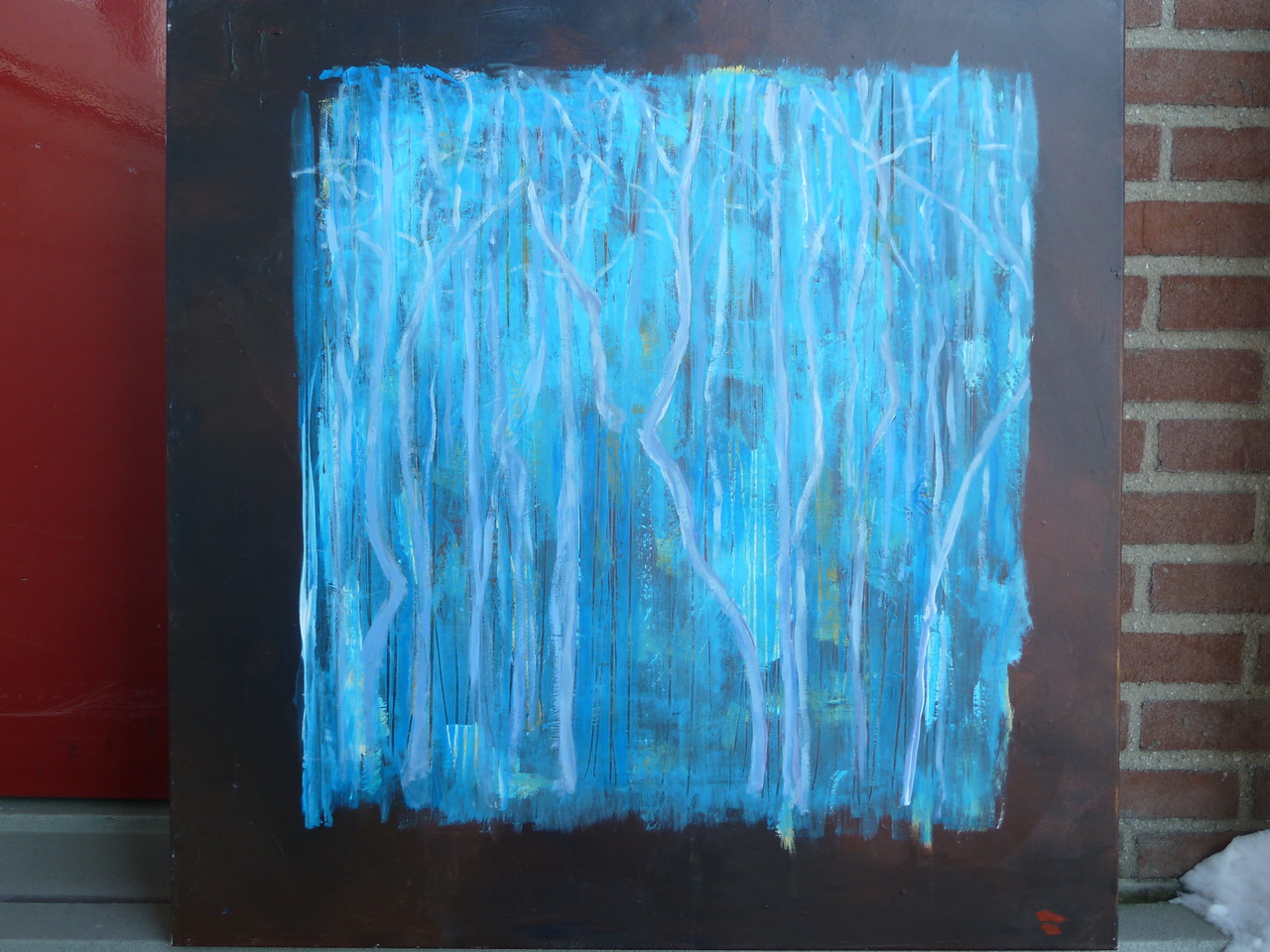 Door over elkaar heen te schilderen krijg ik diepte en via het verticale lijnenspel geeft het de suggestie van bomen weer. De donker bruine brede rand is een mooi contrast met het blauw.
