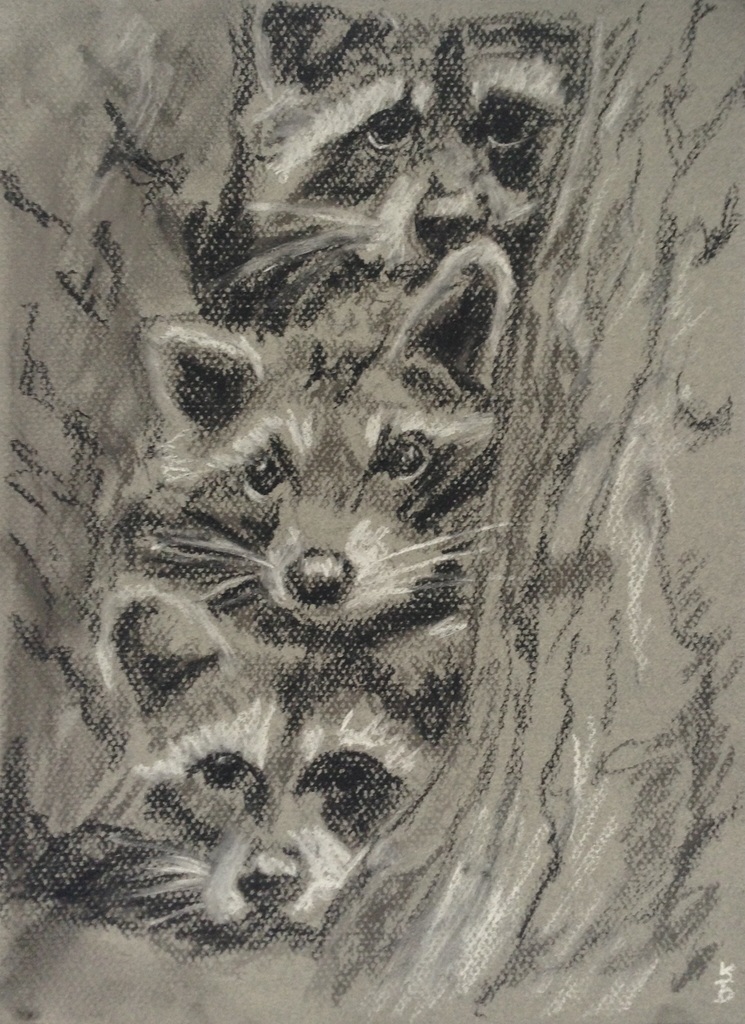 Drie wasberen op 160 gr gekleurd papier. Drie jonge wasberen kijken nieuwsgierig om het hoekje van een boom.