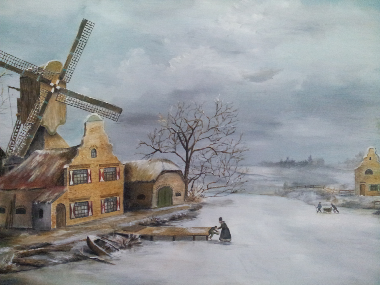 Winterlandschap met boerderij en molen. Mensen schaatsen op het ijs.