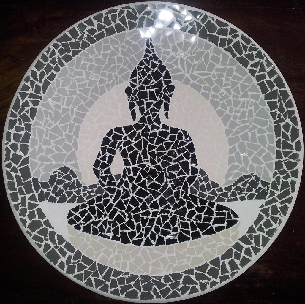 Schaal mozaïekwer doorsnede 45 cm. Boeddha sillouet in zwart-grijs-wit tinten.