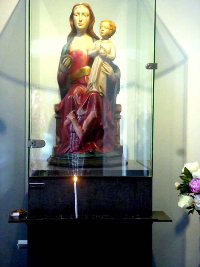 Reflectie vrouw in Maria-beeld