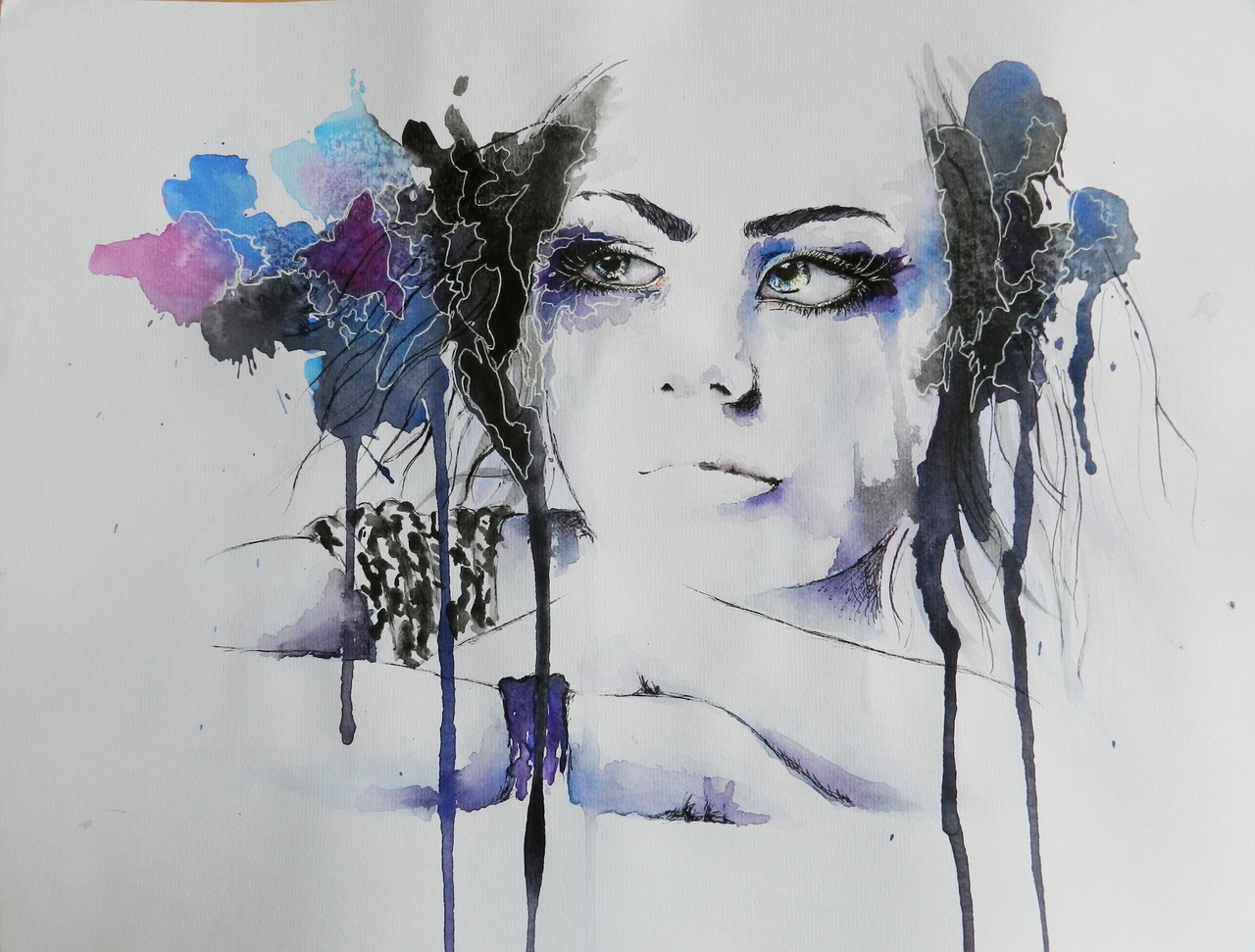 Wit Vrouwen Zwart Blauw Paars Vrouw Portret Blue Woman Aquarel Portrait Women Dromen Roze Black Purple White Watercolor Pink Waterverf Staren Dreaming Staring