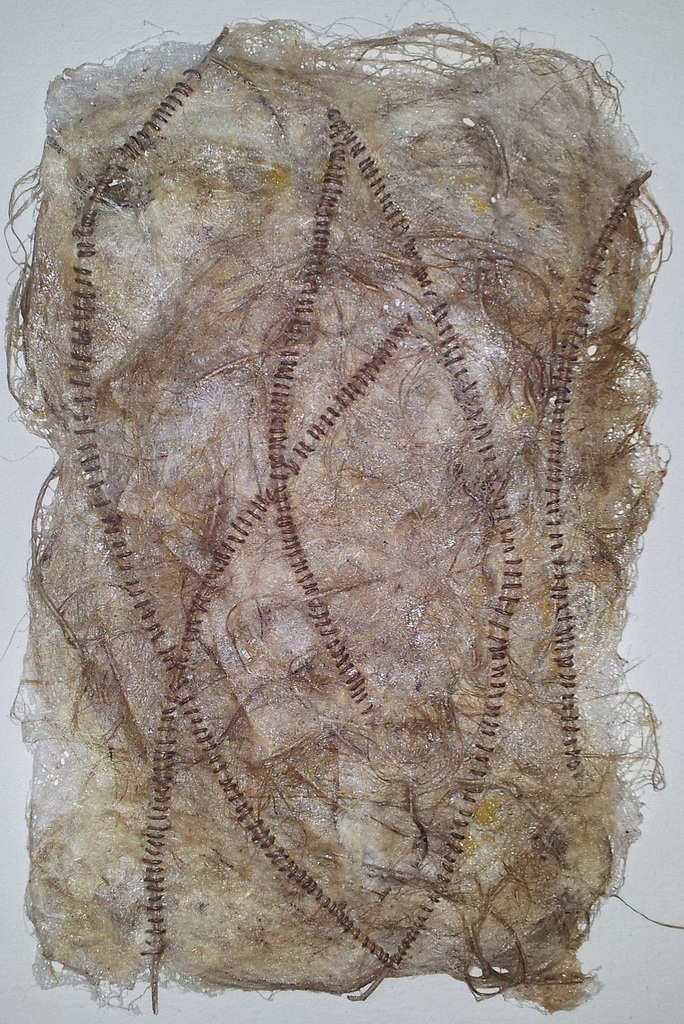 Materiaal: vezels van katoen,vlas, sisal, borduurgaren en acrylbinder met pigment. Techniek: vliezen van vezels en borduren. Serie van tien