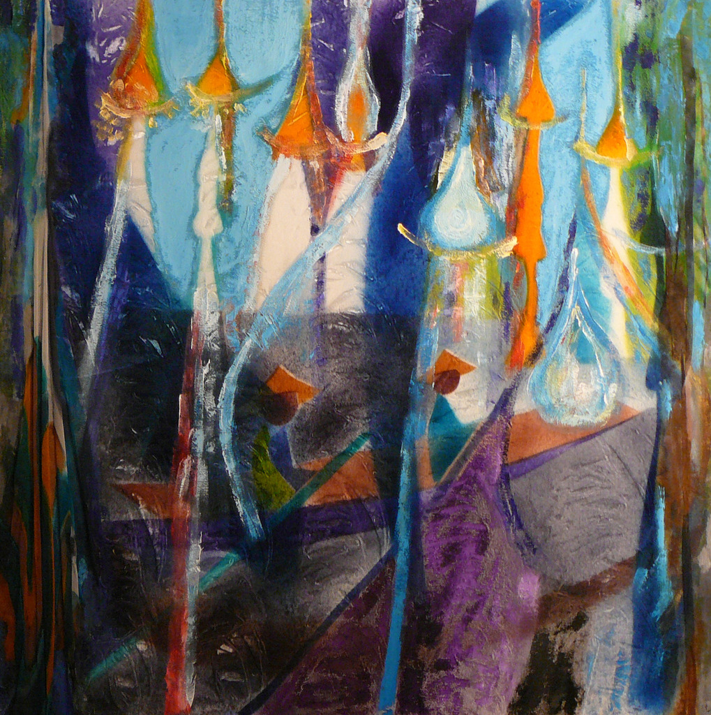 Myanmar 2 is geschilderd op fluweel met zijdeverf en acryl. Gemaakt na een bezoek aan Myanmar.