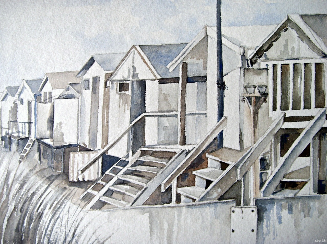 na geschilderd vanaf een door mijzelf gemaakte foto van de strandhuisje op het "kleine" strand in IJmuiden. In lijst met pass partout.