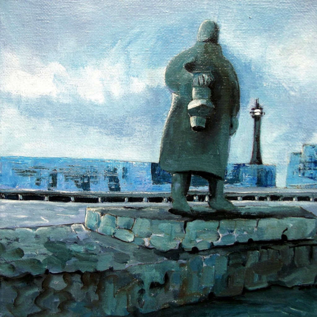 de man met de lamp, het beeld op de kop van de haven in IJmuiden. klein doekje in baklijst