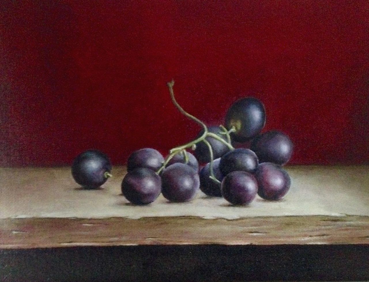 Na de aardbeien en de appel kon een druivenstruikje niet meer ontbreken in de fruitschaal. Het werk is in een zwarte baklijst gevat voor een mooi contrast.