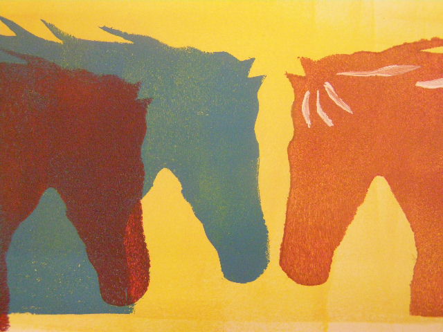 3 paarden in monoprint tbv Brooke hospitals