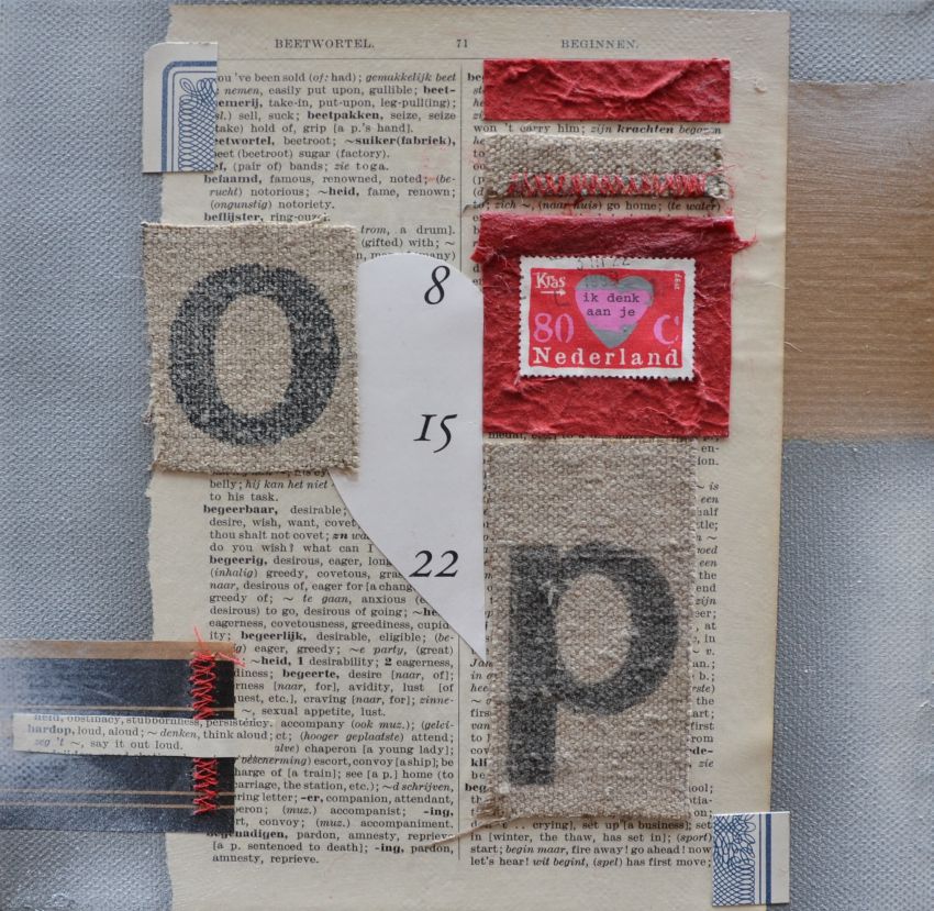 Collage met letters uit een oude postzak, oud papier, postzegel en woordenboek. Op 3D canvas. De collage is geschonken aan het project Collage around the world, waarbij het geëposeerd wordt in Brazilië.