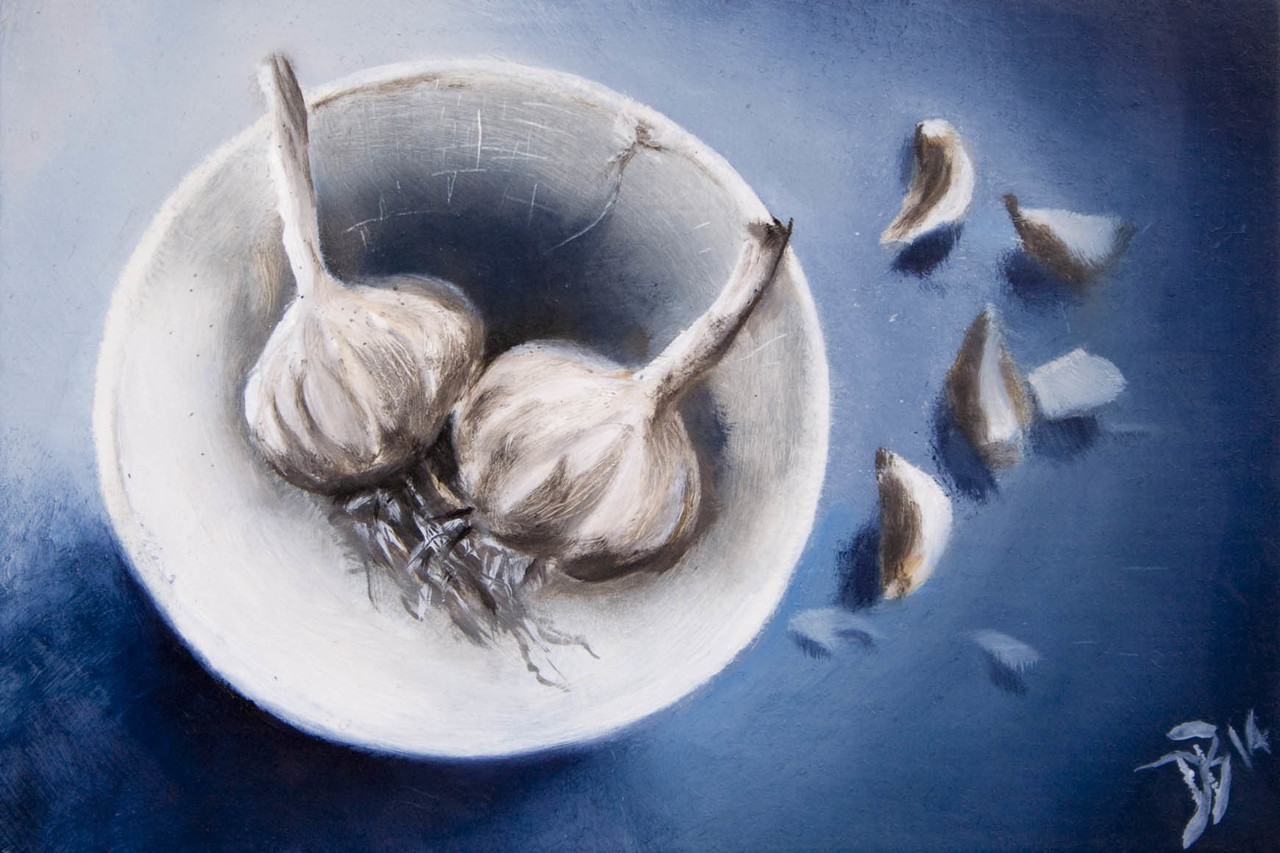 Fijnschilderwerk; knoflook in keramisch schaaltje Deel 4 uit de serie "Life & Death"