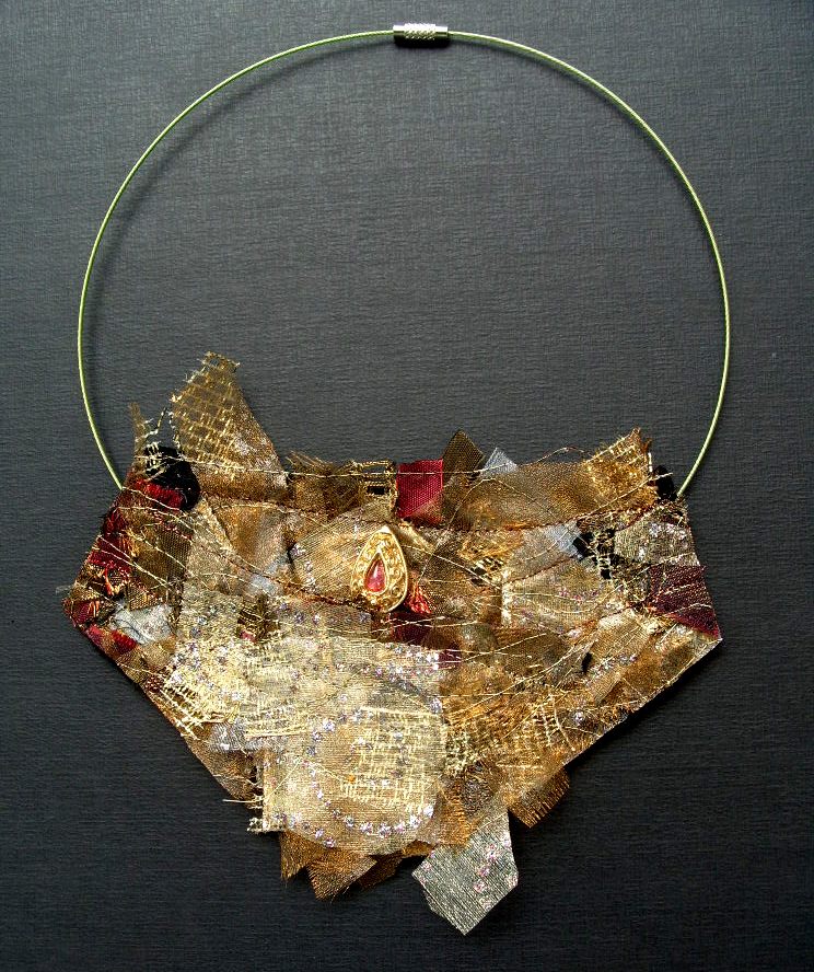 43. Diverse soorten textiel en broche 15 x 9 cm.Afgewerkt met zwart vilt.Spang 47 cm.