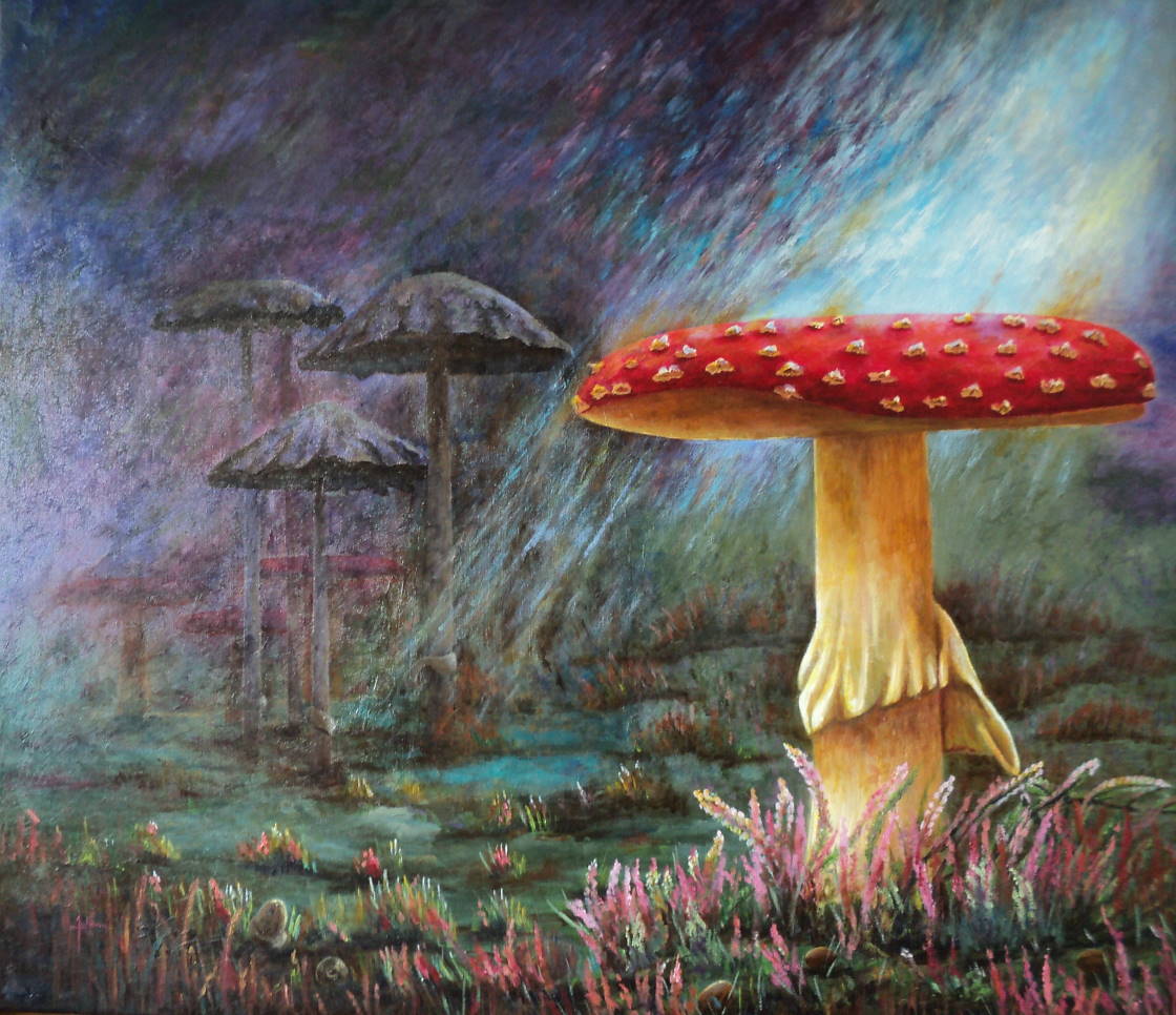 Een paddestoel in een surrealistisch bos