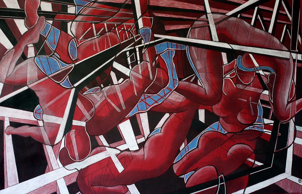 Drawing is a discipline in which ‘looking outside’ and ‘looking and moving within the frame of the paper’ is very important. Sources of inspiration are urban and industrial landscapes and shapes of the human body. Tom’s work consists of countless shades of black but he also uses colour in an exciting way. The artworks change as the daylight changes. Observations and impressions from spending time outdoors inspire his artwork. His skilled drawings may develop into new drawings as well as paintings. In his paintings he combines colour, patches and blots with lines to create several spaces.
