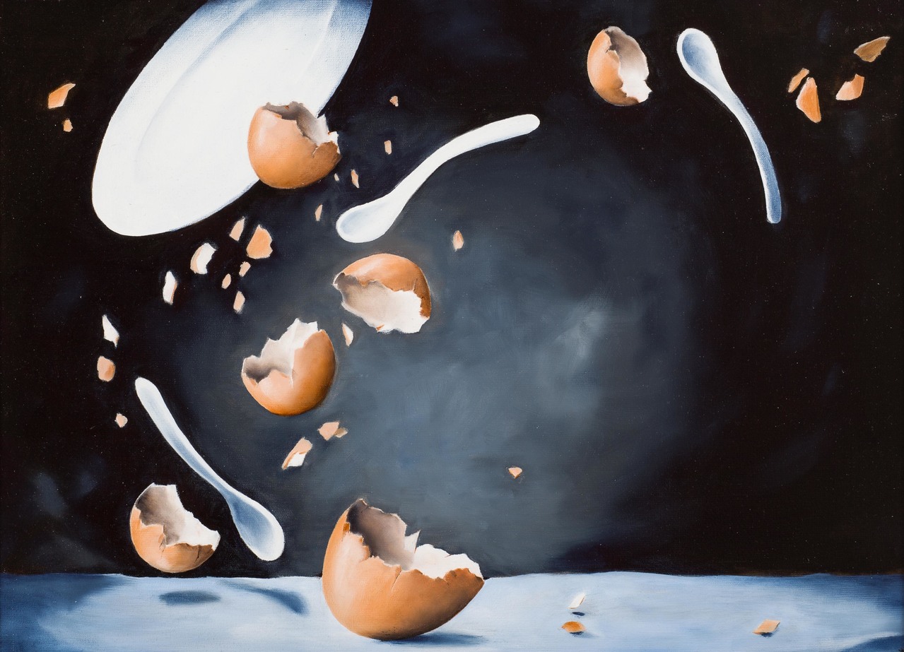 Eieren representeren het leven, vruchtbaarheid - de eierschillen slechts het levenloze omhulsel - wegwaaiend in een werveling van leven - het dynamische stilleven vangt de beweging in een bijna surrealistische compositie met lepels..