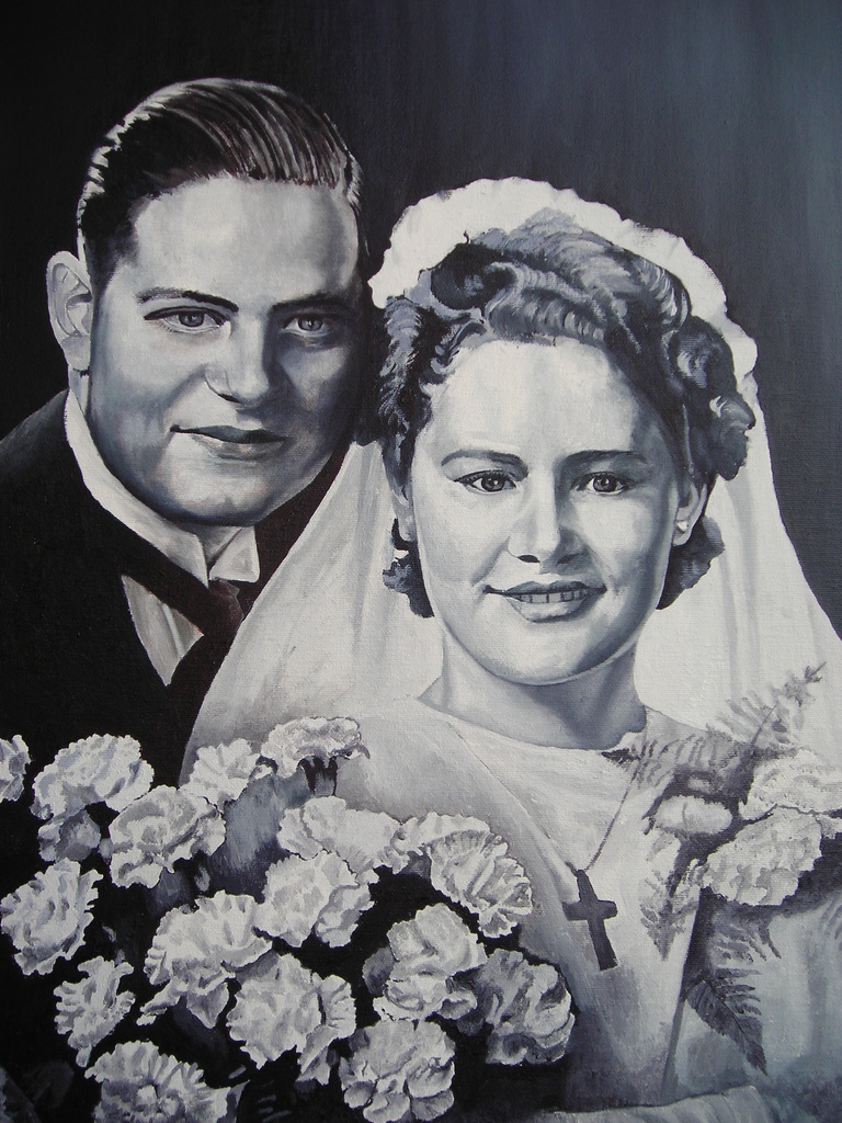 portret van opa en oma op hun trouwdag in sepia stijl