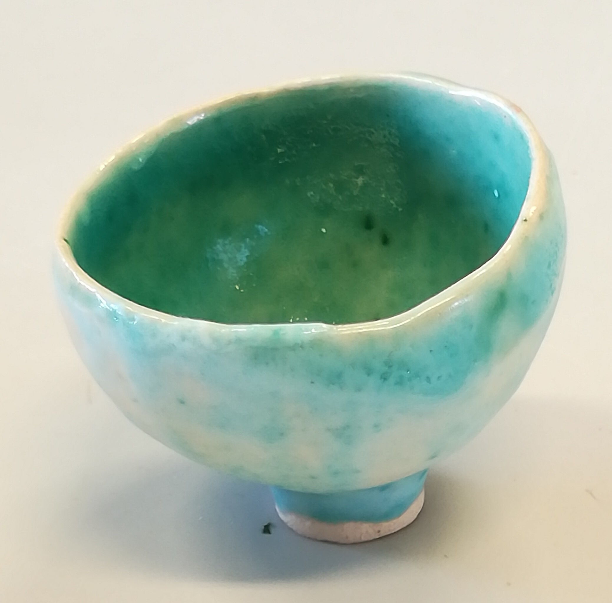 Keramiek kommetje op voetje, handgevormd, asymmetrisch, turquoise glans glazuur, Japanse invloed imperfectie is schoonheid.